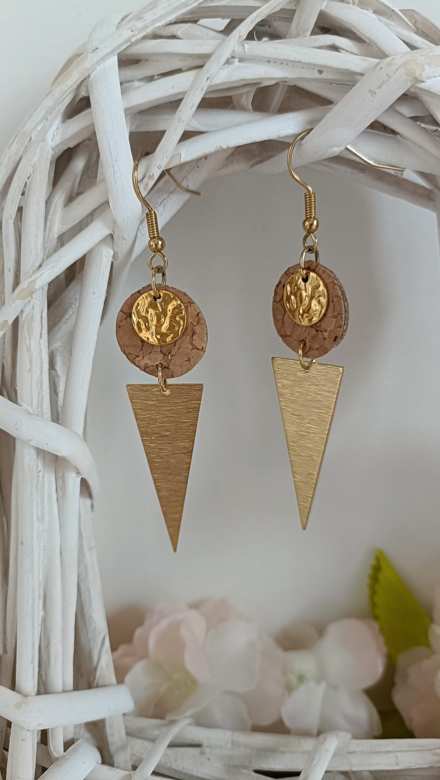 Boucles d’oreilles géométriques en liège naturel et doré, élégantes et légères, pour une touche chic, moderne et lumineuse.