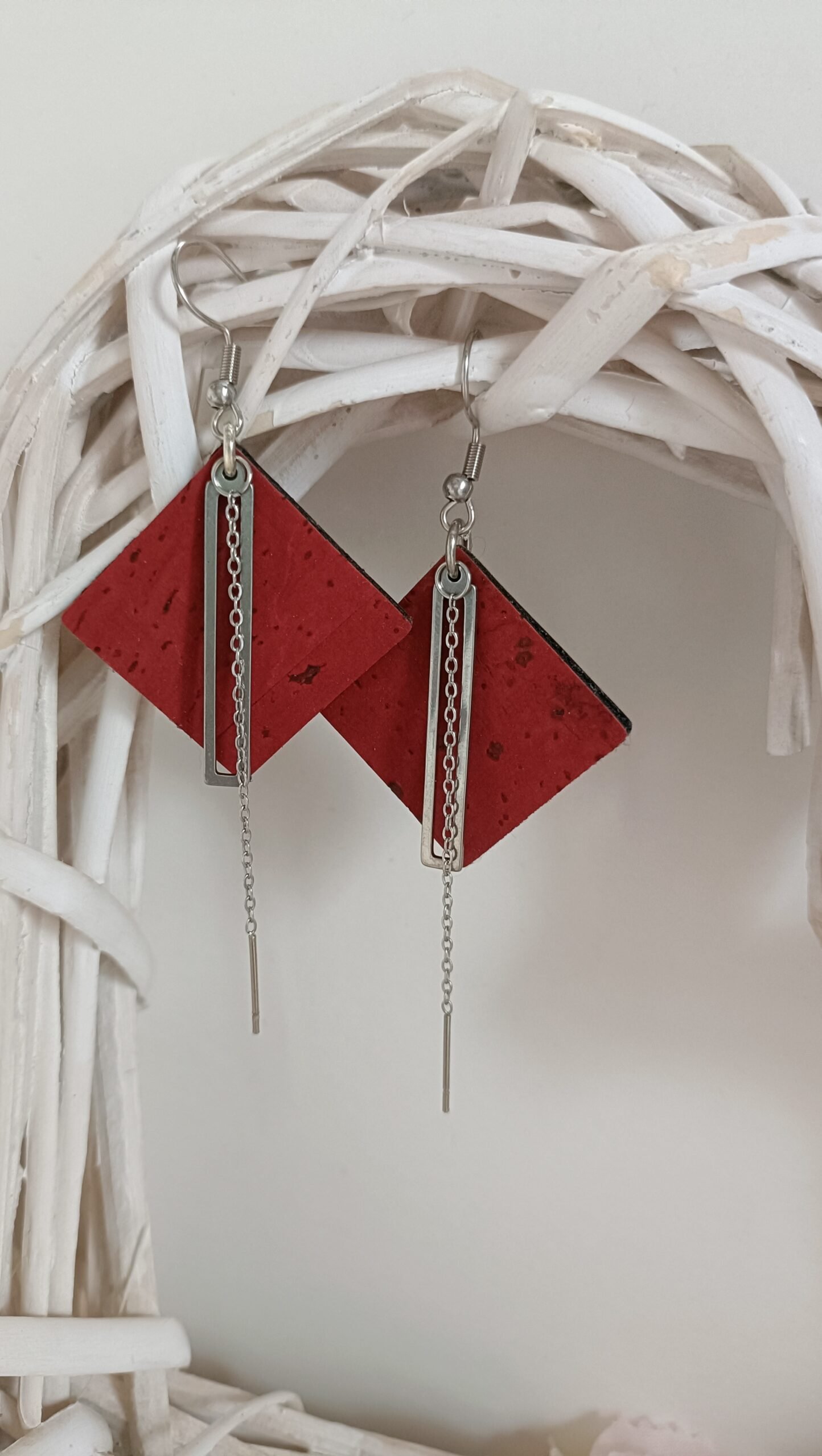 Ces boucles d’oreilles ne se contentent pas d’être élégantes ; elles sont également conçues pour durer. La tige et la chaînette, fabriquées en acier inoxydable argenté, offrent non seulement une grande résistance, mais aussi une finition brillante et moderne qui contraste parfaitement avec la texture subtile du cuir de liège. Le tout crée un équilibre parfait entre style et durabilité.