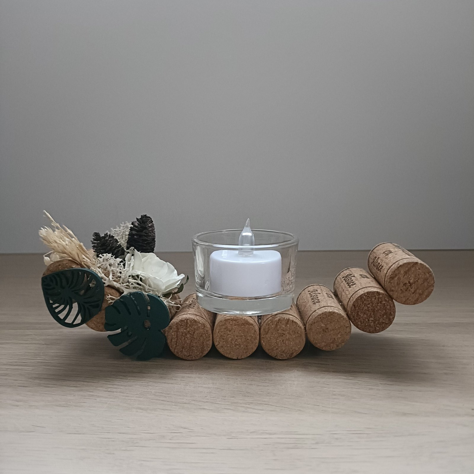 Un bougeoir unique en forme de gondole, confectionné à partir de bouchons de liège et décoré de bouquets de fleurs séchées ou de fleurs en papier/tissu. Son photophore avec bougie LED diffuse une lumière douce pour une ambiance naturelle et élégante.