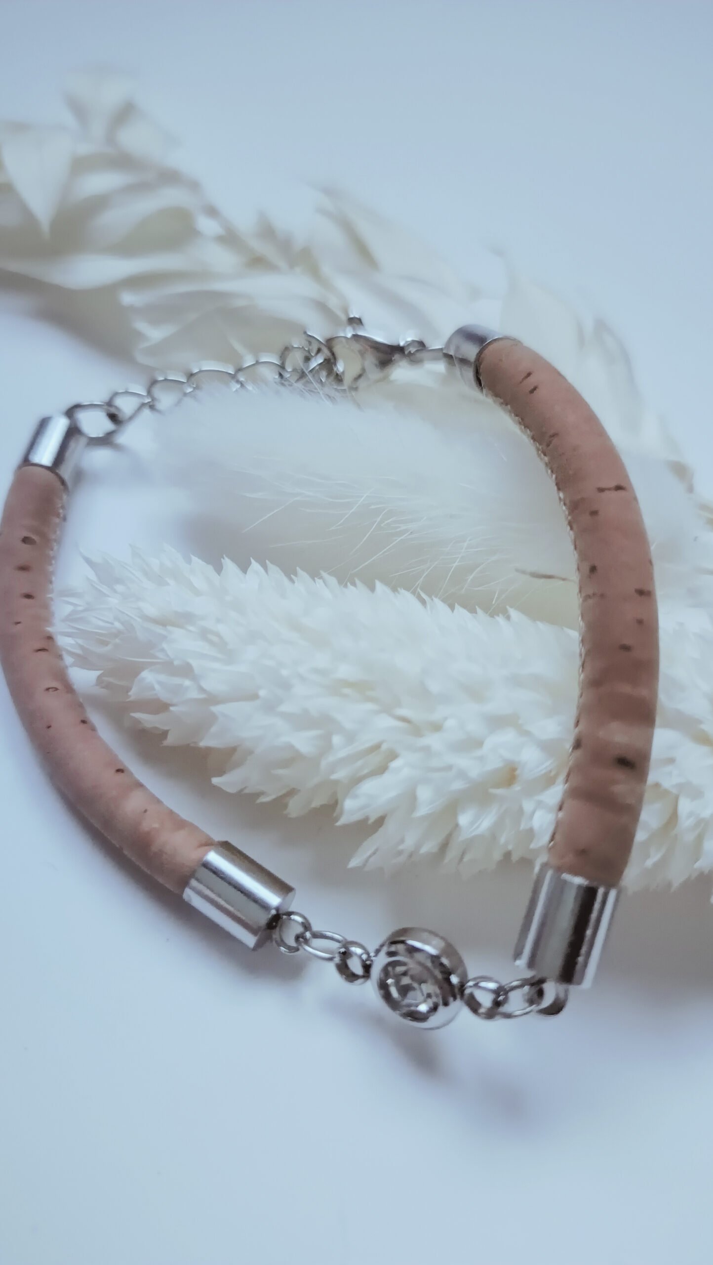 Ce bracelet artisanal met en valeur un cabochon argenté en verre finement intégré qui capte la lumière et attire les regards. Il ajoute ainsi une touche de sophistication au design. Le cordon en cuir de liège offre une texture agréable et un look distinctif. Le bracelet se ferme grâce à un fermoir pince de homard, à la fois pratique et élégant. Toutes les pièces métalliques sont en acier inoxydable de haute qualité. Ce choix de matériaux garantit une longévité exceptionnelle tout en offrant une résistance aux rayures et à la corrosion.