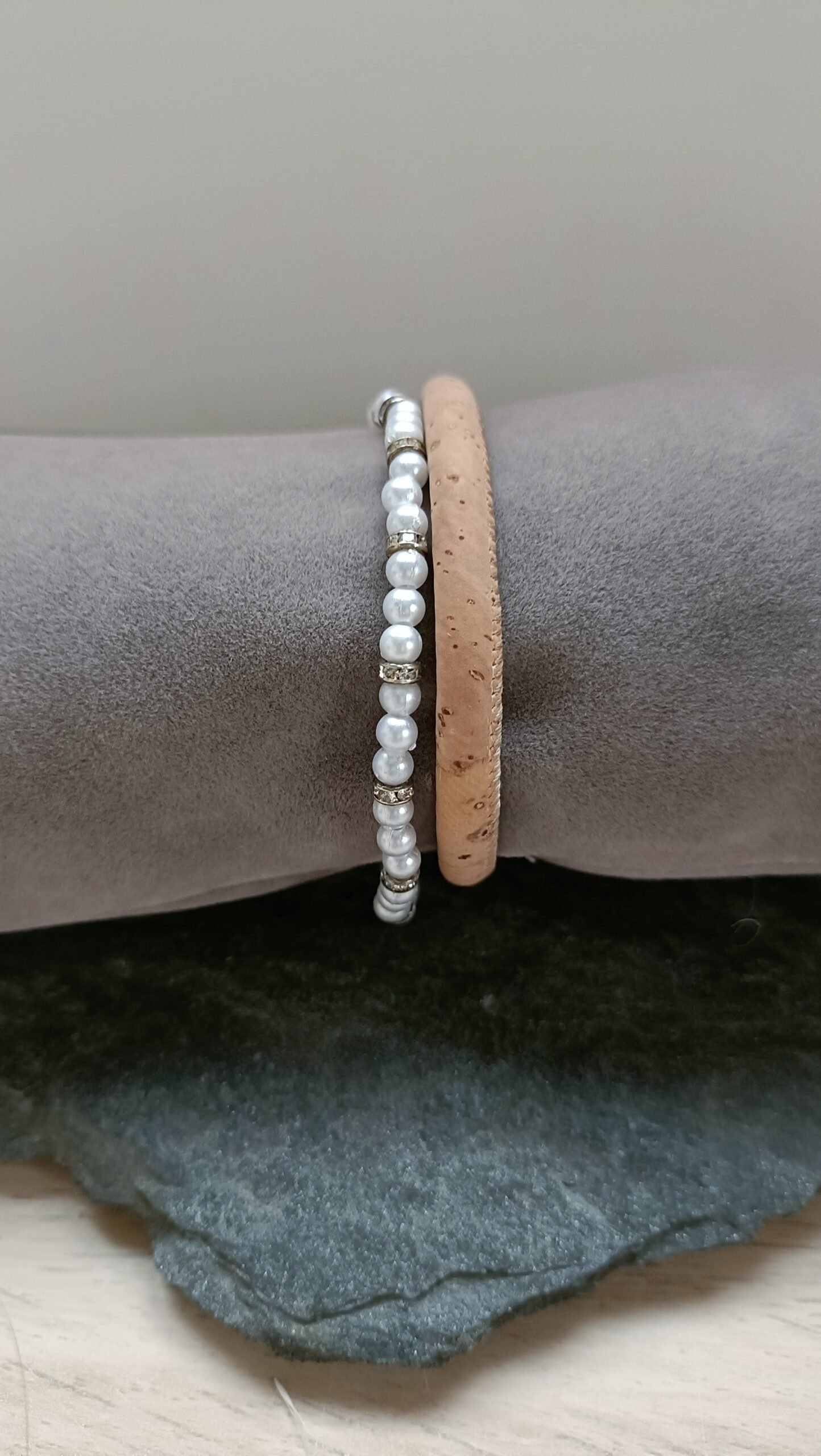 Le bracelet Angélique allie charme naturel et élégance intemporelle. Ce bijou est composé d’un bracelet en liège délicatement accompagné d’un bracelet en fines perles blanches. De subtils intercalaires en strass entre les perles apportent une touche lumineuse et raffinée. Ce bracelet s’ajuste aussi bien aux looks décontractés qu’aux tenues sophistiquées.