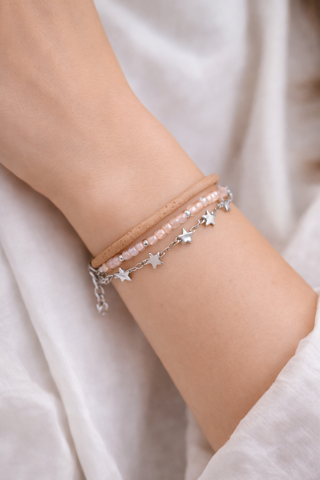 Le bracelet s’accompagne d’une chaînette en acier inoxydable ornée de petites étoiles délicates, ajoutant une touche scintillante à votre tenue. Un bracelet en perles roses translucides, rehausse parfaitement le tout pour sublimer vos looks avec une note féminine et sophistiquée.