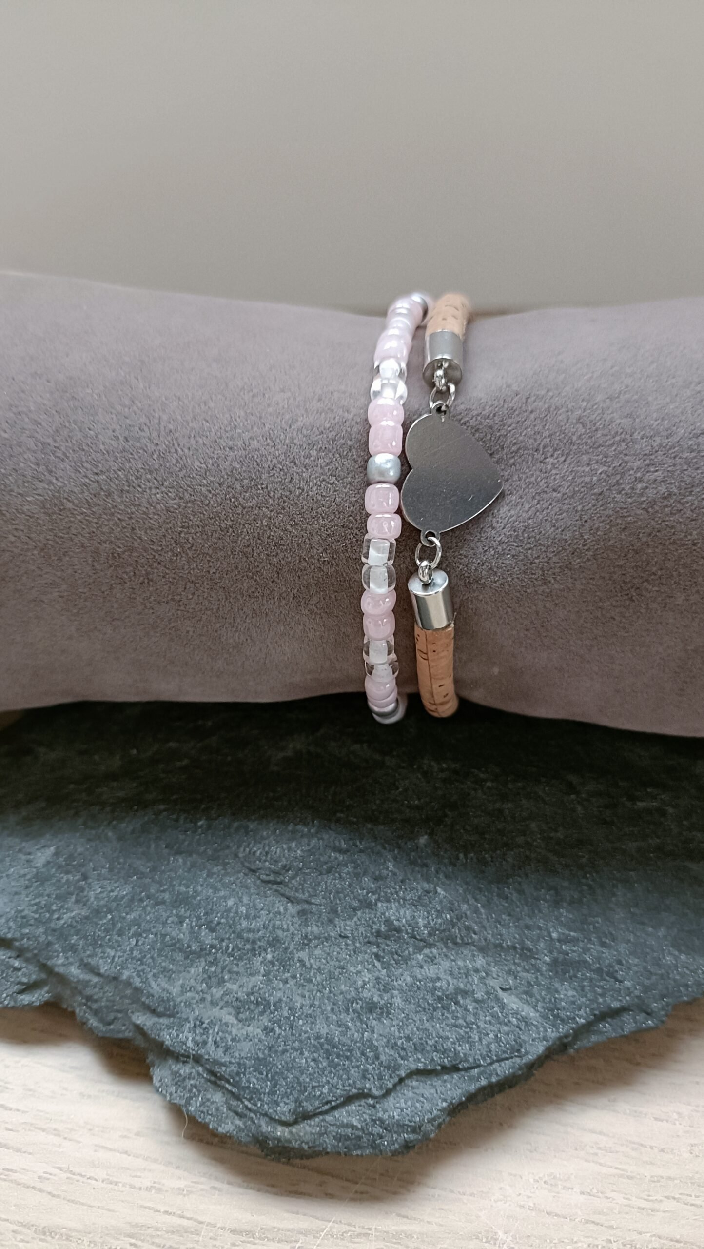 Pour compléter ce look raffiné, un bracelet composé d’un mélange de perles roses, grises et transparentes rehausse le liège d’un subtil éclat. Les couleurs douces et variées apportent une touche de modernité et se marient parfaitement avec le bracelet en liège. Le bracelet Nina incarne l’harmonie entre la nature et la féminité.