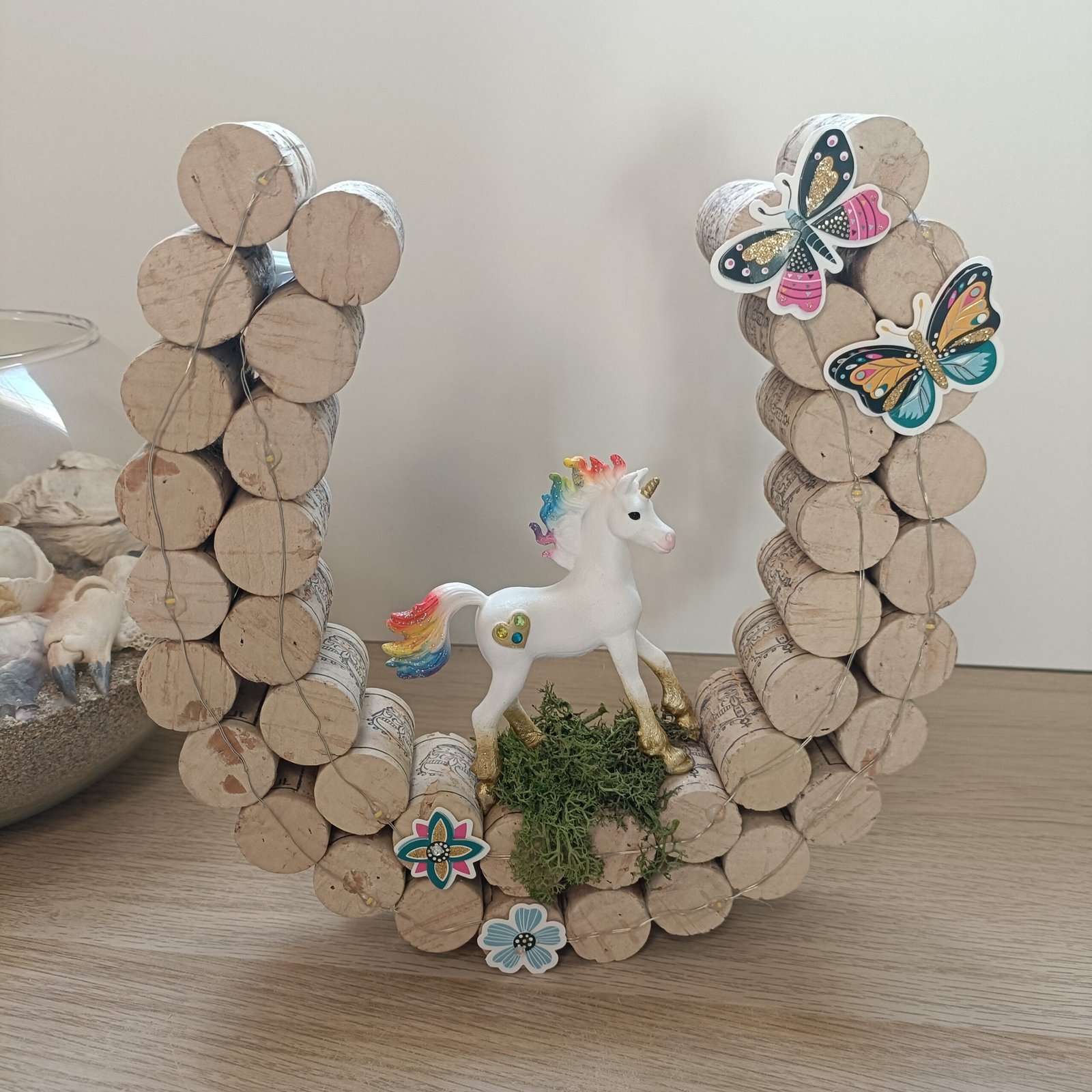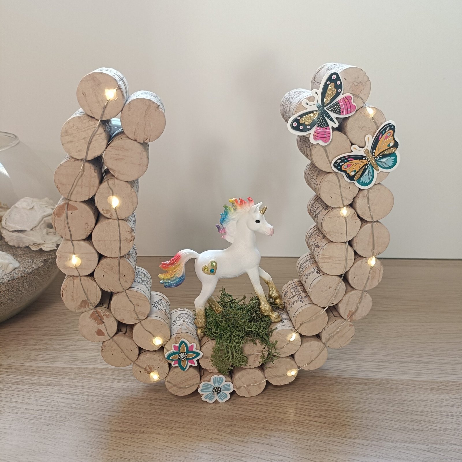 Découvrez cette décoration fer à cheval “Licorne”, fabriquée à partir de bouchons de liège recyclés. Ce fer à cheval fait main est non seulement une magnifique œuvre d’art, mais aussi un hommage à l’écoresponsabilité. Sa conception en liège donne une touche naturelle et chaleureuse à votre espace. Et vous permet ainsi de prendre part à une démarche écologique intelligente.